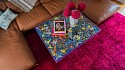 Direct embroidery and laser-cut luxury boxes with velvet typography appliqué with on vintage wallpaper