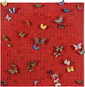 Acrylic on embroidered twill-wrapped tiles with embroidered butterflies